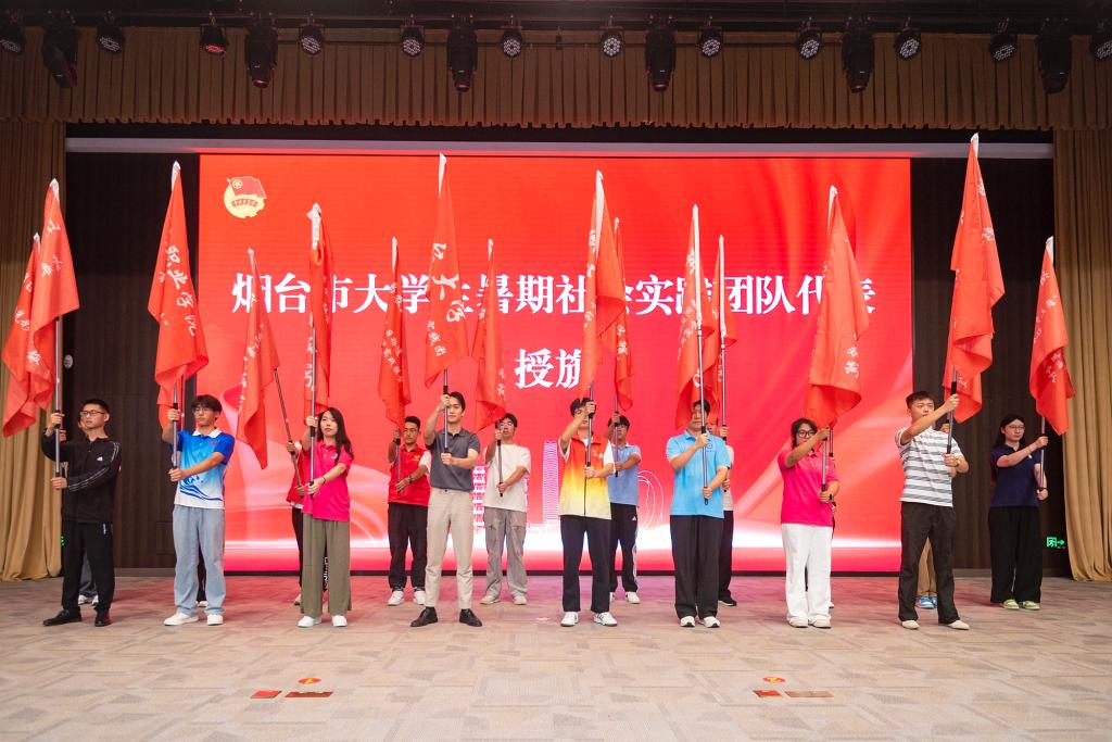 共青團煙臺市委副書記王丹怡宣讀《關于開展2025年煙臺市大學生暑期助力綠色低碳高質量發展示范城市建設社會實踐活動的通知》。張坤、姚昌為煙臺市大學生暑期社會實踐團隊代表授旗。煙臺大學王羽嘉同學和煙臺職業學院于灃同學作為煙臺市暑期社會實踐團隊代表進行交流分享。盧海峰同學帶領煙臺市大學生暑期社會實踐代表團隊宣誓。