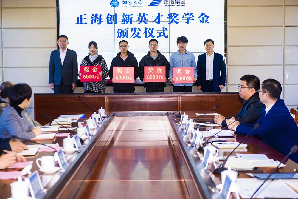 【本站訊】12月2日,煙臺(tái)大學(xué)“正海創(chuàng)新英才獎(jiǎng)學(xué)金”頒發(fā)儀式在育秀大樓316舉行。正海集團(tuán)黨委副書(shū)記、工會(huì)主席全杰,正海磁材黨委書(shū)記、總經(jīng)理李志強(qiáng);煙臺(tái)大學(xué)副校長(zhǎng)畢可志,黨委統(tǒng)戰(zhàn)部常務(wù)副部長(zhǎng)、教育發(fā)展基金會(huì)秘書(shū)長(zhǎng)李育華,機(jī)電汽車工程學(xué)院、化學(xué)化工學(xué)院等相關(guān)單位負(fù)責(zé)人出席頒獎(jiǎng)儀式。儀式由黨委學(xué)生工作部部長(zhǎng)杜昊主持。
