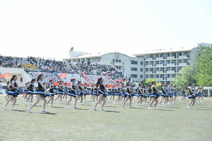 5月16日8時(shí)30分,運(yùn)動(dòng)會(huì)開幕式上,來(lái)自外國(guó)語(yǔ)學(xué)院的啦啦操隊(duì)身著藍(lán)白相間的統(tǒng)一服裝,像一群藍(lán)精靈一樣向操場(chǎng)中央奔來(lái)。